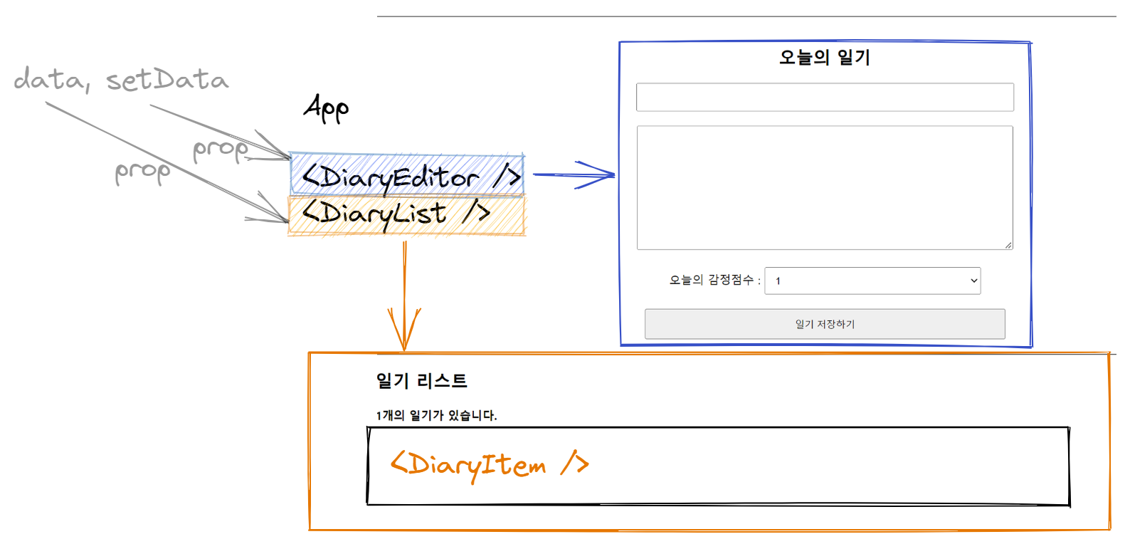 DiaryEditor에서 일기를 작성하면 DiaryList에서 그걸 받아서 일기 리스트 화면에 보여주려고 한다.